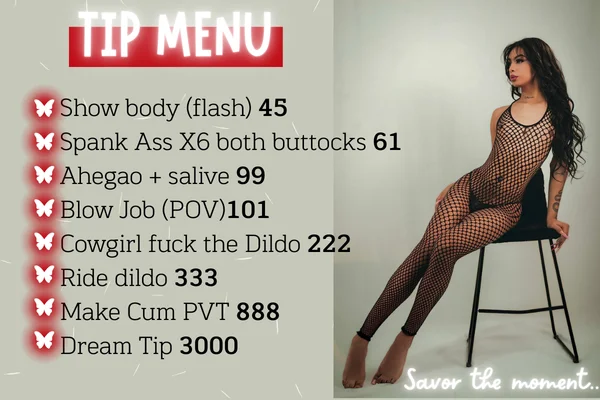 Ahegao, Spanking, Erotisk dans, Fingring, Skittensnakk, Stripping, Doggy style, Dildo eller vibrator, Ejakulering, Røyking, Ydmykelse, Onani, Oljeshow, Cumshot, Cosplay, Fotfetish, Deepthroat, Analleketøy, Handjob, Twerk, Cowgirl
